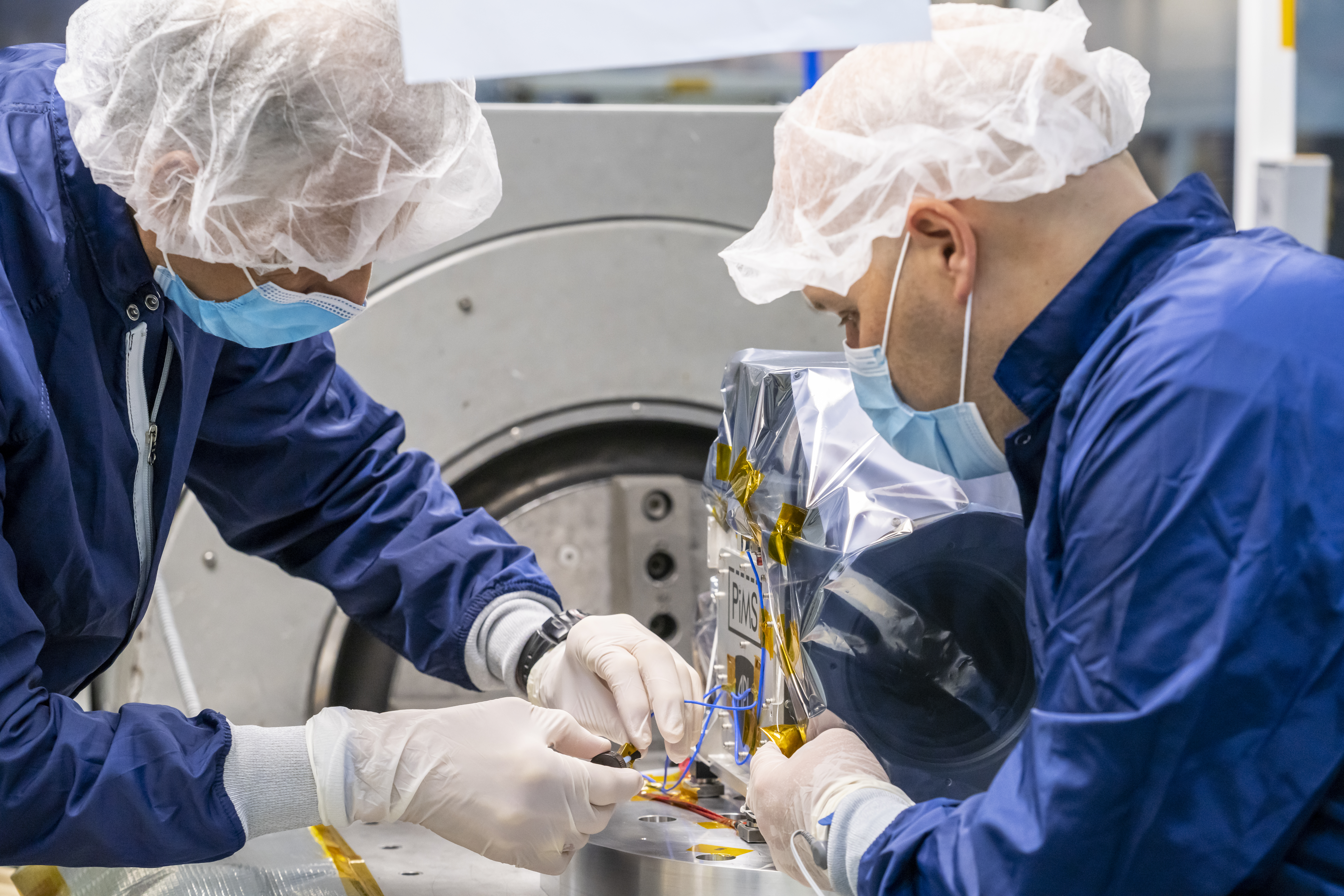 An accelerometer is attached to a plasma instrument (called PIMS) sensor assembly during a vibration test. Vibration Test Laboratory lead engineer Hadi Navid (left) and PIMS mechanical engineer Erik Hohlfeld wear cleanroom garments to keep the hardware clean and free of biological contaminants while affixing the accelerometer. The device, one of many installed for this test, measures accelerations and, by extension, forces experienced by the PIMS sensor assembly while it is subjected to a simulated launch vibration environment. The PIMS sensor assembly is placed on a vibration table, commonly referred to as a shaker, to perform this test.