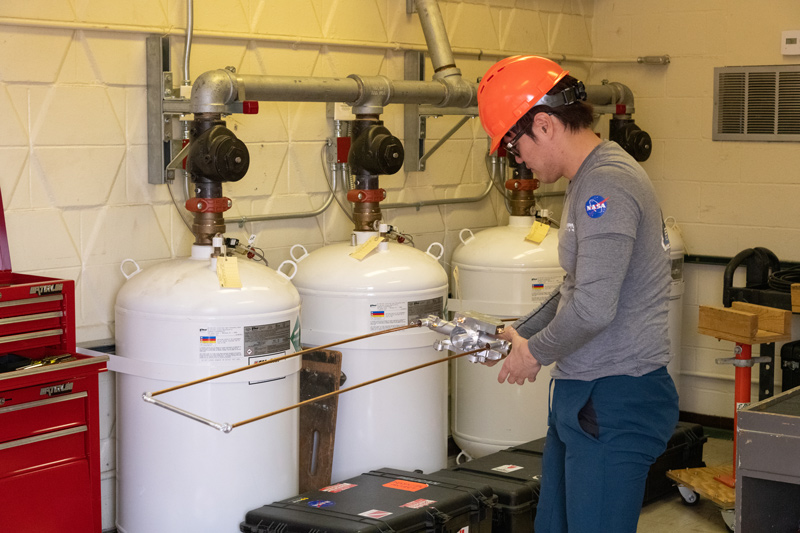 A JPL engineer holds one of four VHF radar antennas for Europa Clipper’s REASON instrument in its deployed configuration. In its stowed configuration for launch, the device will be about the size of a small lunchbox. In the weeks after launch, the VHF antenna will deploy to its operational configuration, of 8.5 feet (2.6 meters) long.