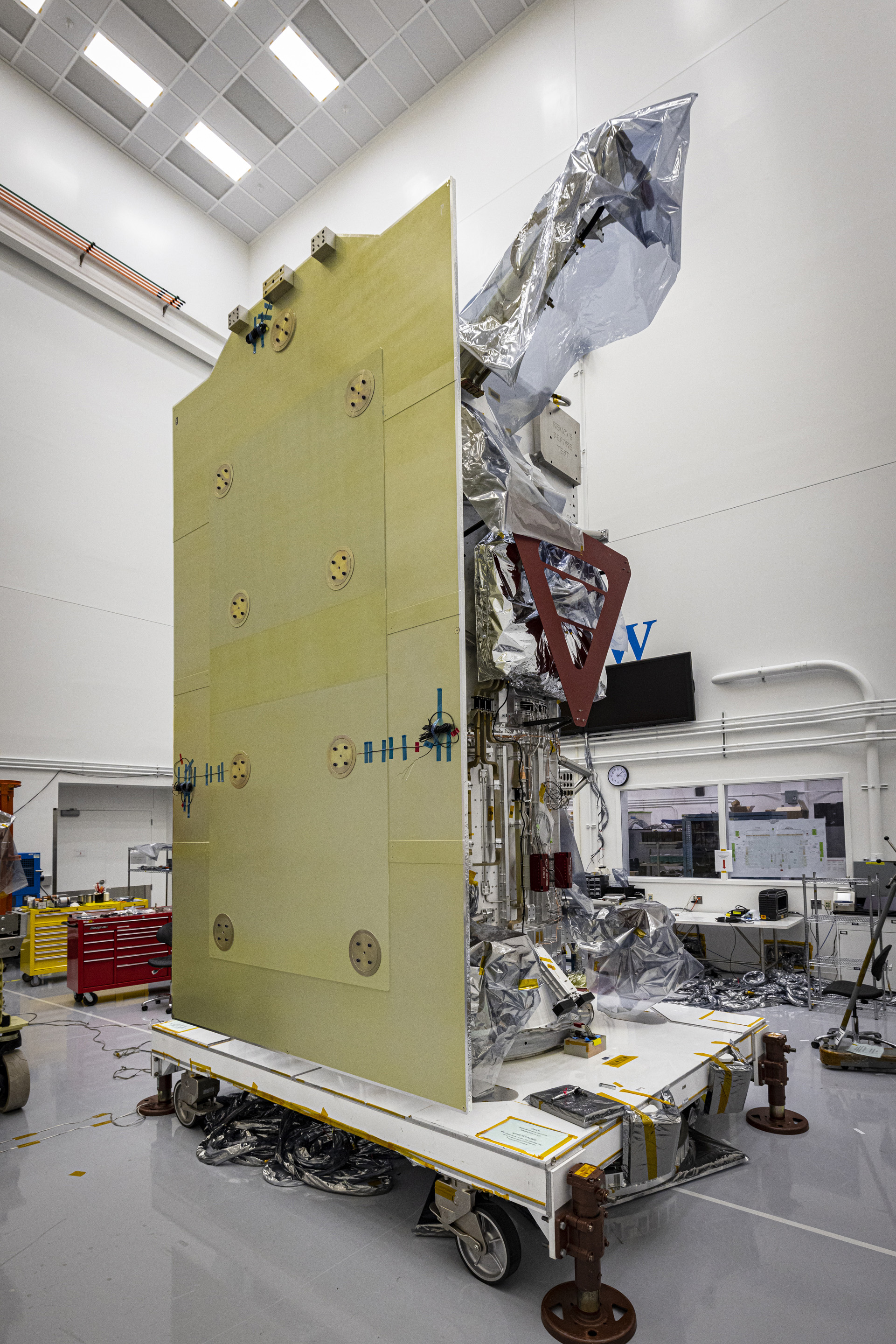 The Europa Clipper Solar Array Mechanical Simulator (SAMS) is shown installed on the spacecraft’s propulsion module as a part of a weeklong effort at the Johns Hopkins Applied Physics Laboratory (APL) in Laurel, Maryland, to check that the solar array struts were correctly fabricated and installed onto the spacecraft structure. SAMS is a mass and geometry simulator for a single solar array wing that will be used as a part of spacecraft structural testing.