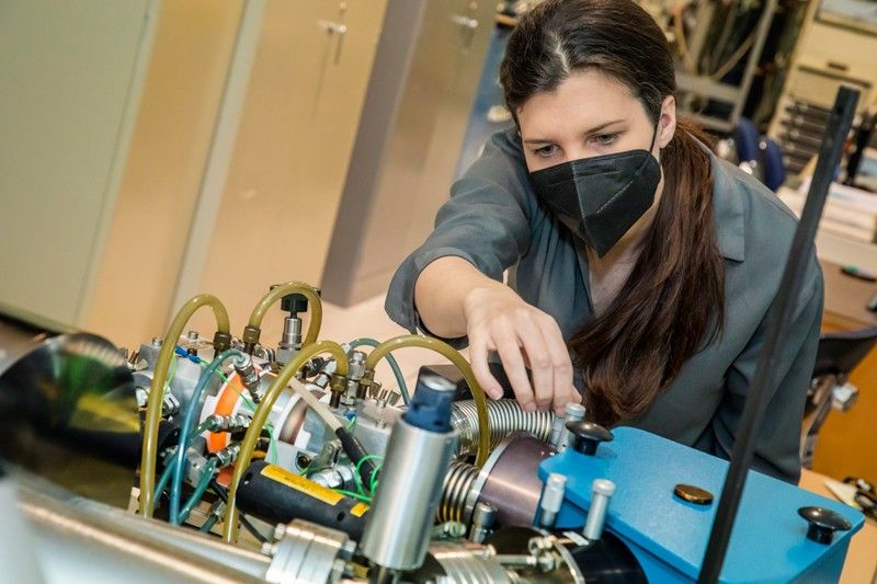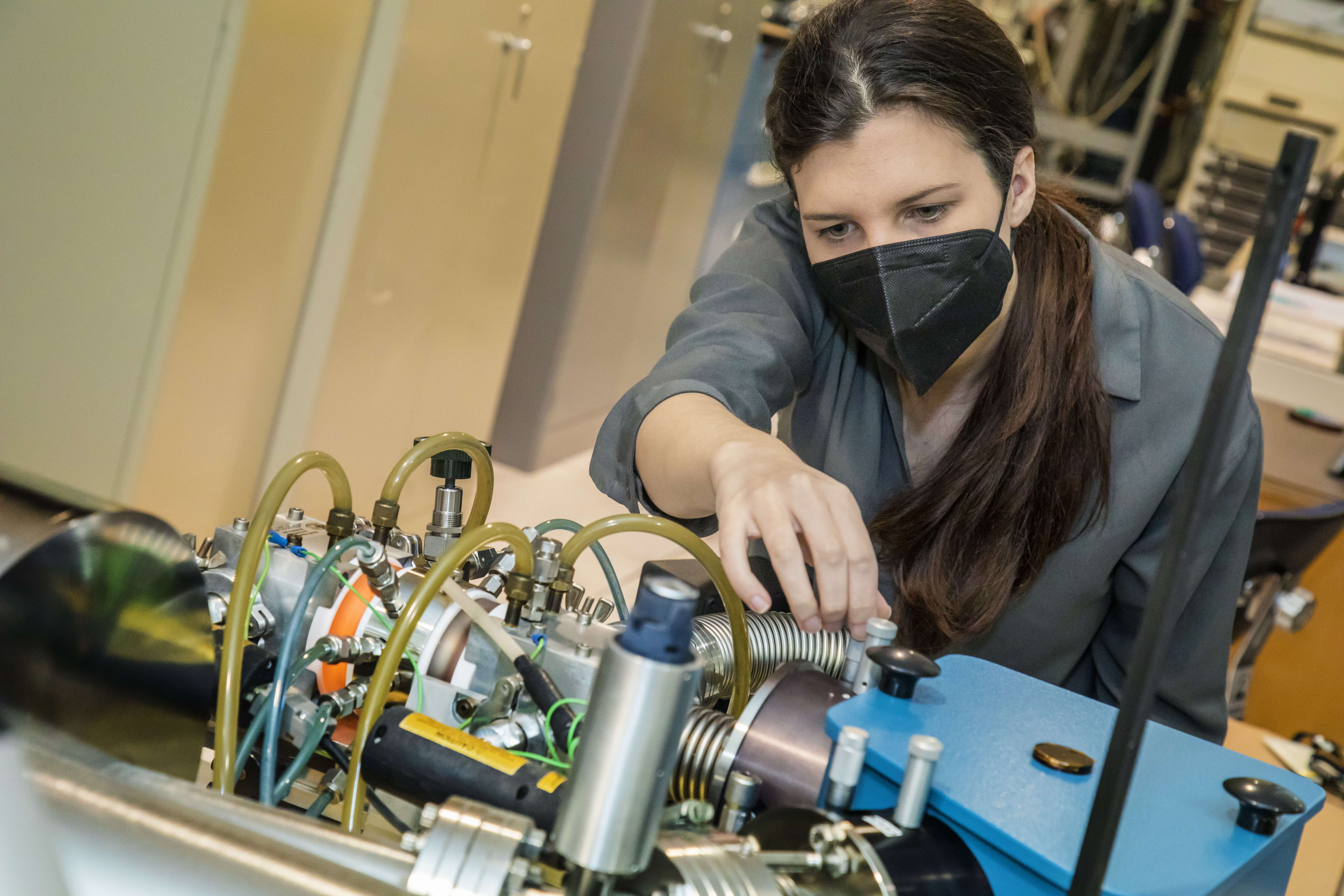 Southwest Research Institute’s Dr. Philippa Molyneux adjusts laboratory equipment used to calibrate Europa Clipper’s ultraviolet spectrograph (Europa-UVS) and confirm that the instrument is functioning properly.