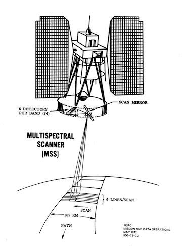 The MSS technology was a novel way of looking at Earth. It used a scanning mirror to build up an image pixel-by-pixel with six scan lines sweeping across the satellite’s ground path 13.62 times per second as the satellite hurtled around Earth at over 14,400 mph. As the first civilian imaging scanner to orbit Earth, many of the scientists and engineers outside the small cadre of scanner enthusiasts wondered if the satellite’s MSS instrument would be able to successfully produce an image traveling at such a high velocity. This made for a harrowing day when the first imagery was transmitted back to Earth two days after launch.