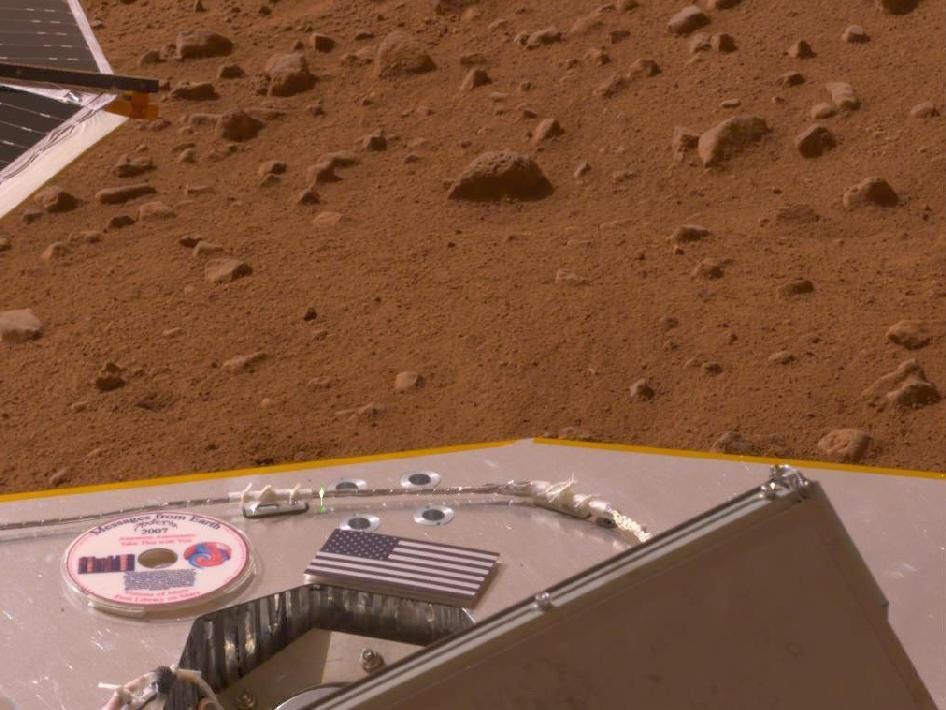 This view of an American flag on metal recovered from the site of the World Trade Center towers shortly after their destruction on 11 Sept. 2001, was taken on Mars on 11 Sept. 2011, the 10th anniversary of the attacks on the towers. The aluminum component bearing the image of the flag serves as the cable guard of a tool on NASA's Mars Exploration Rover Opportunity.