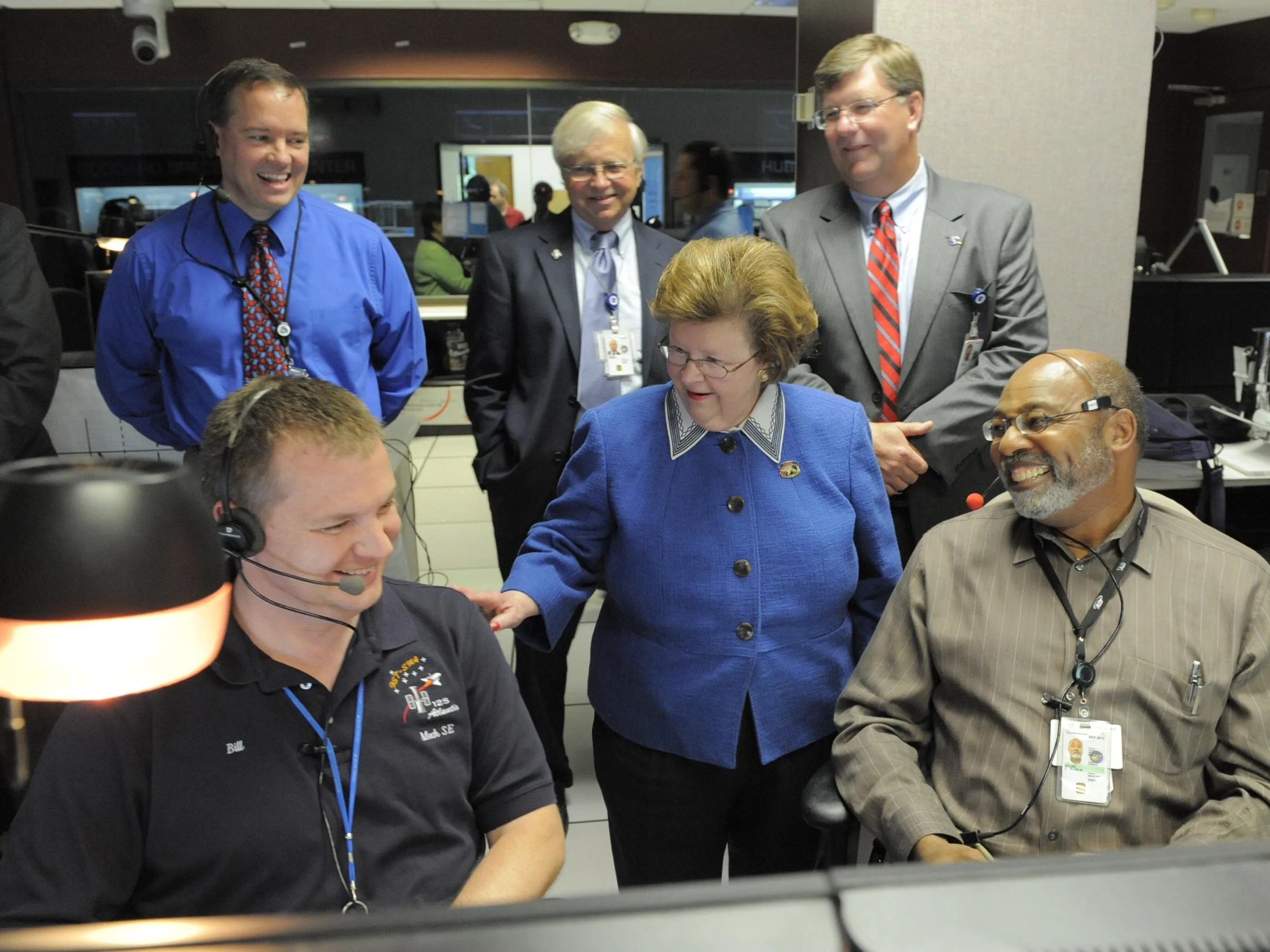 Senator Barbara Mikulski speaks with two Space Telescope Operations Control Center (STOCC) flight team members at the Mechanical Systems console in the STOCC. Bill Nilsson (left foreground) and Carlton Miller (right foreground) were part of the Orbit Team of flight controllers that oversaw deployment of the Hubble Space Telescope from Shuttle Atlantis on Tuesday, May 19, 2009.