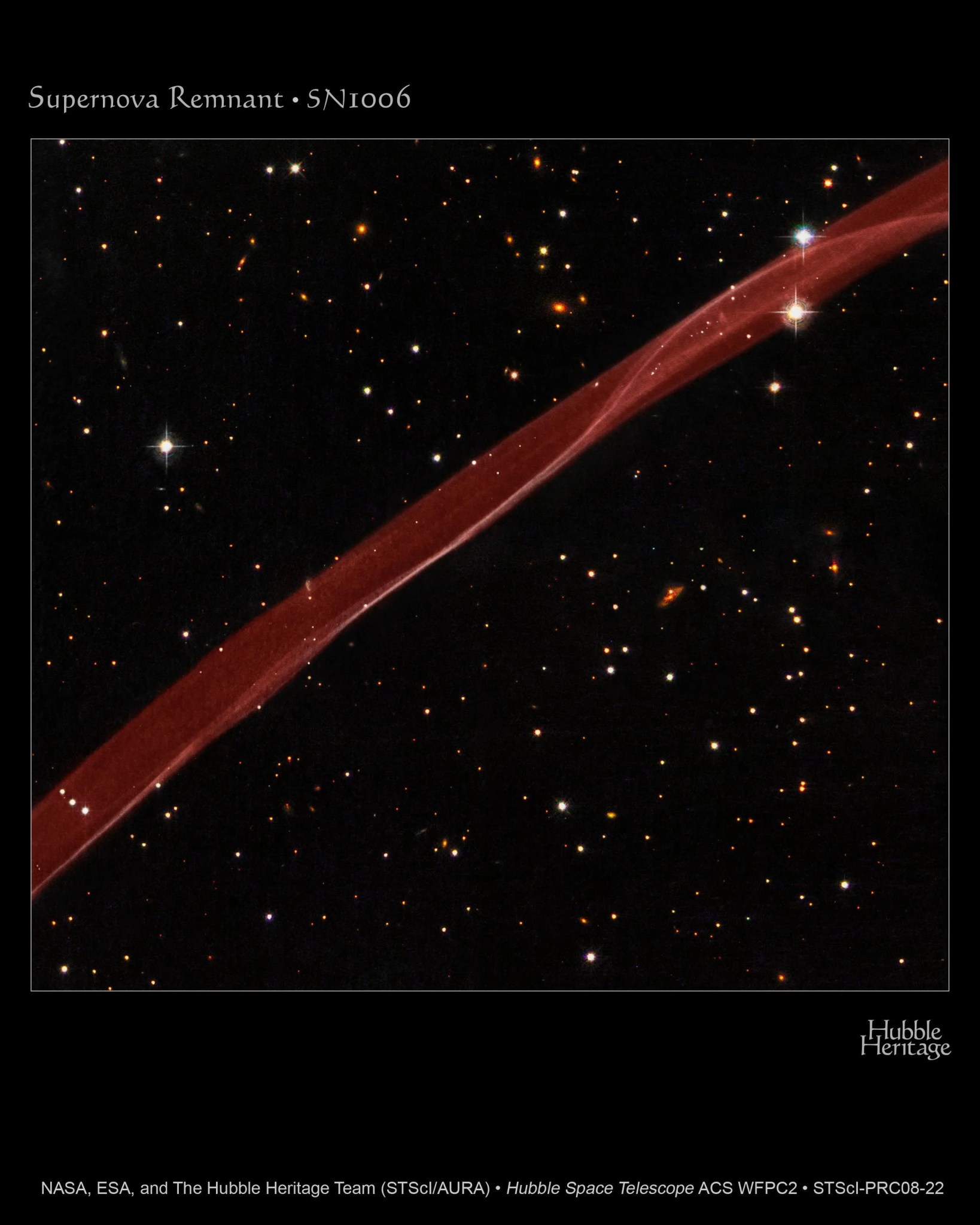 Today, SN 1006 has a diameter of nearly 60 light-years, and it is still expanding at roughly 6 million miles per hour. Even at this tremendous speed, however, it takes observations typically separated by years to see significant outward motion of the shock wave against the grid of background stars. In the Hubble image as displayed, the supernova would have occurred far off the lower right corner of the image, and the motion would be toward the upper left.