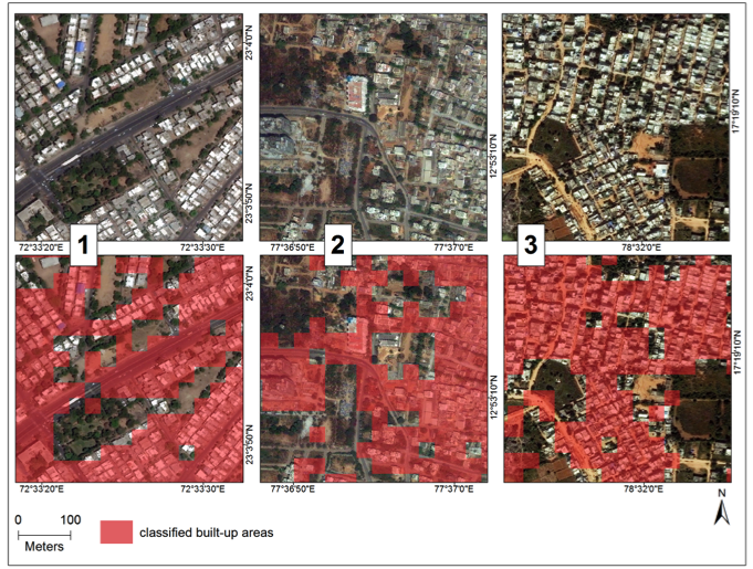 A detailed examination of the classification of built-up areas (visualized in red) compared to raw satellite images in five regions in India (classifier: Random forest with 10 trees, input: Landsat 8). Satellite images from DigitalGlobe. Includes copyrighted material of DigitalGlobe, Inc., All Rights Reserved.