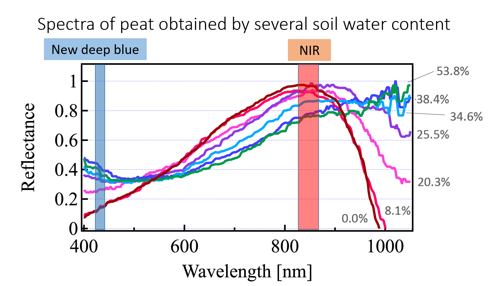 In near infrared (deep blue) region, reflectance directly measured from the peat moss are more complex than previously thought, in case of high water content of soil and of the peat soil rich condition. Those results differ from the findings of a high absorption coefficient of pure water in both wavelength regions.