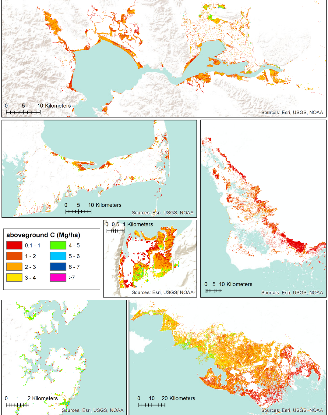 Tidal marsh aboveground carbon density maps of six study regions, based on the final biomass model and plant percent carbon content data. Moving from top, left to right: San Francisco Bay, CA; Cape Cod, MA; Everglades, FL; Nisqually National Wildlife Refuge, WA; Chesapeake Bay, MD; Terrebonne and St. Mary Parishes, LA. Image credit: Byrd et al.