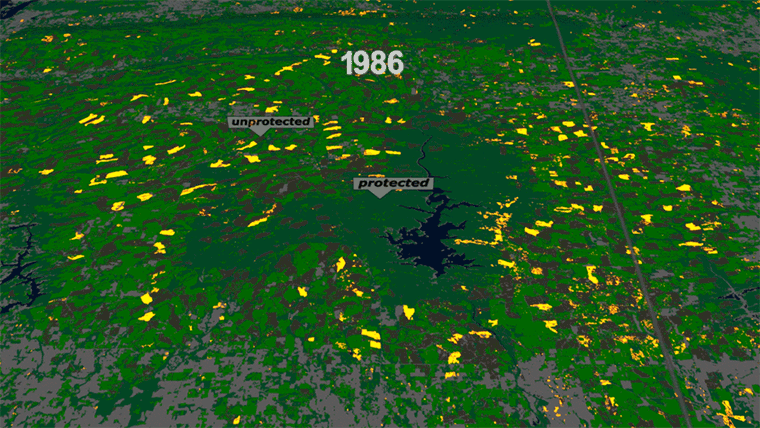 With data from Landsat satellites, scientists can study deforestation and land management practices worldwide. Here, a visualization of satellite data from 1986 to 2010 shows where trees were cut each year (in yellow) and where the land was undisturbed for the 25-year time period (dark green) near an Oklahoma reservoir. Animation credit: NASA’s Goddard Space Flight Center