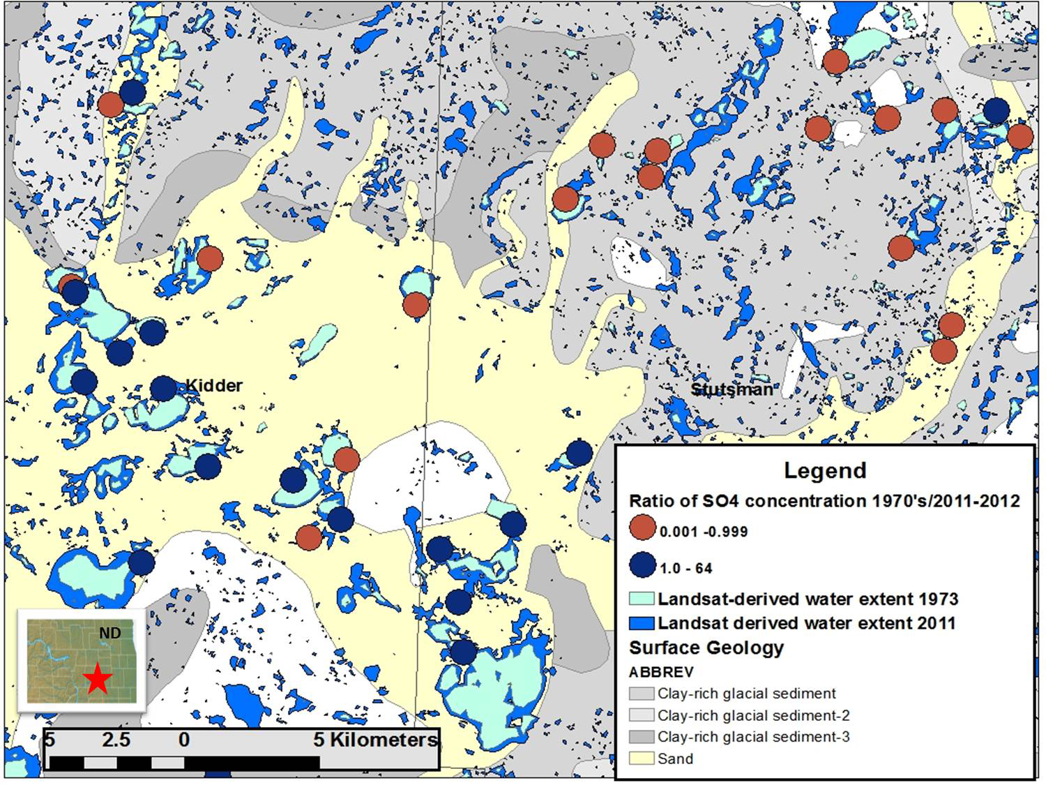 This image shows a portion of the Prairie Pothole Region (see location map). The figure illustrates the variability of lake chemistry—red dots are lakes for which sulfate increased between the 1970’s and 2012-2013, whereas the blue dots show water bodies with a sulfate decrease over this time period. The lakes are shown by Landsat satellite imagery in two colors reflecting their extent in 1973 (light blue) and 2011 (dark blue). May of these were dry in 1973. The base of the figure is surface geology. The water bodies with decreasing sulfate over time are larger and associated with sandy portions of the landscape, whereas those with sulfate increase over time are associated with clay-rich portions of the landscape. Image credit: Martin Goldhaber, USGS