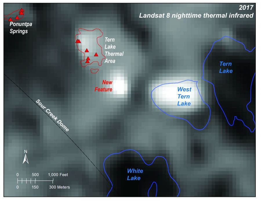 Landsat 8 thermal infrared images are a great resource for examining thermal areas—especially when the temperature-sensitive images are acquired at night when the contrast between thermal areas and unheated ground is highest. Analysis of a Landsat-8 nighttime thermal infrared image acquired in April 2017 revealed an unexpected warm area between West Tern Lake and the previously mapped Tern Lake thermal area. This mysterious patch of bright pixels in the thermal infrared image did not match any previously mapped thermal areas. Could it be a lake? At night, lakes are warmer than the surrounding land and stand out in thermal infrared images, but only if they are liquid (i.e., not frozen).