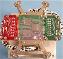 The three squares in the center of the circuit board are QWIPs, which are gallium arsenide semiconductor chips. Each QWIP can measure 327,680 pixels. The QWIPs on TIRS detect two narrow segments of the thermal infrared spectrum.