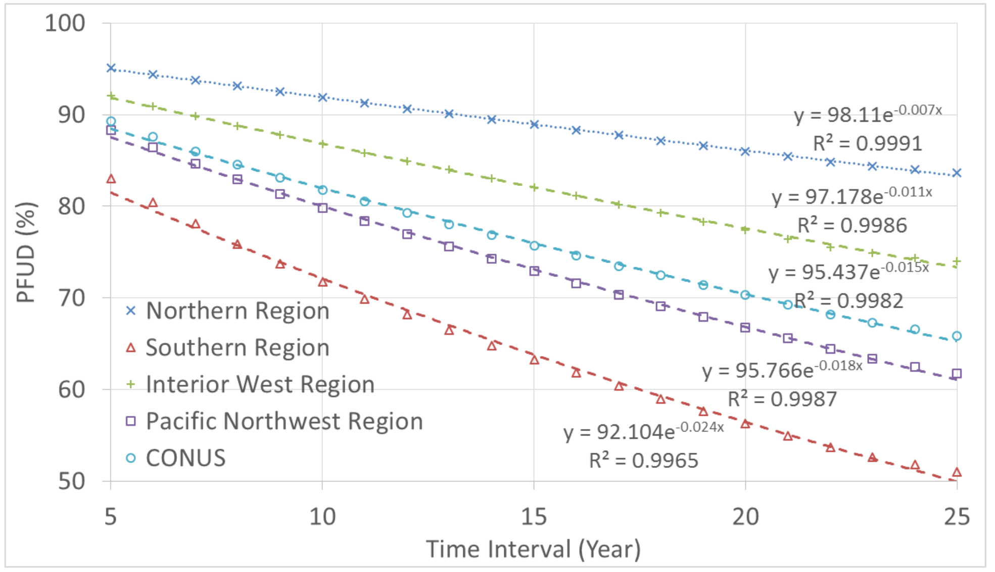Figure 2. Percent forest remaining undisturbed (PFUD) within a time interval decreased following an exponential decay function in the conterminous U.S. and each of its four regions as the time interval increased. Image credit: Huang et al.