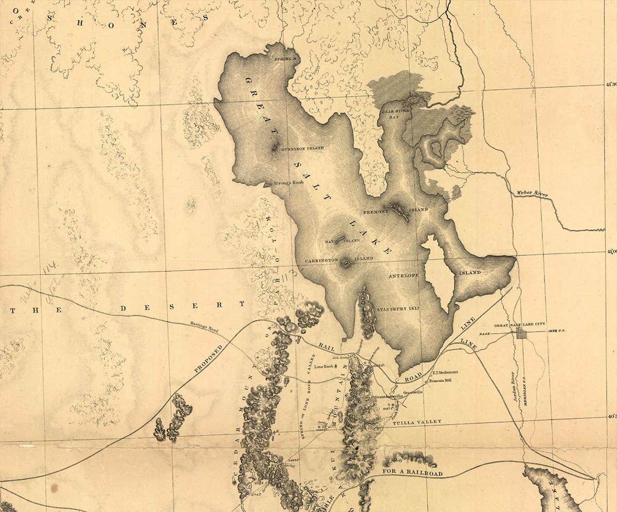 Engineers had put together the recently-invented steam engine with the practicality of a road made of rails and cross-ties, and businessmen and politicians were envisioning a national transportation network – a railroad system. What a difference that could make in the life of this still-young nation! The federal government began sending dozens of mapmakers across the country to identify and draw the best routes for a national railroad in an initiative called “the Great Reconnaissance.” The work was physically demanding and dangerous. One expedition leader was killed by a hostile native Tribe. The group of mapmakers sent to Utah by Jefferson Davis, Secretary of War, fared with better health and included a German-born fellow called Frederick Egloffstein. He was a military man, explorer, mapmaker, landscape artist and engraver. As topographer for the expedition, he made the map we see at left: the Great Basin with a “Proposed Rail Road Line” along the southern end of Great Salt Lake.