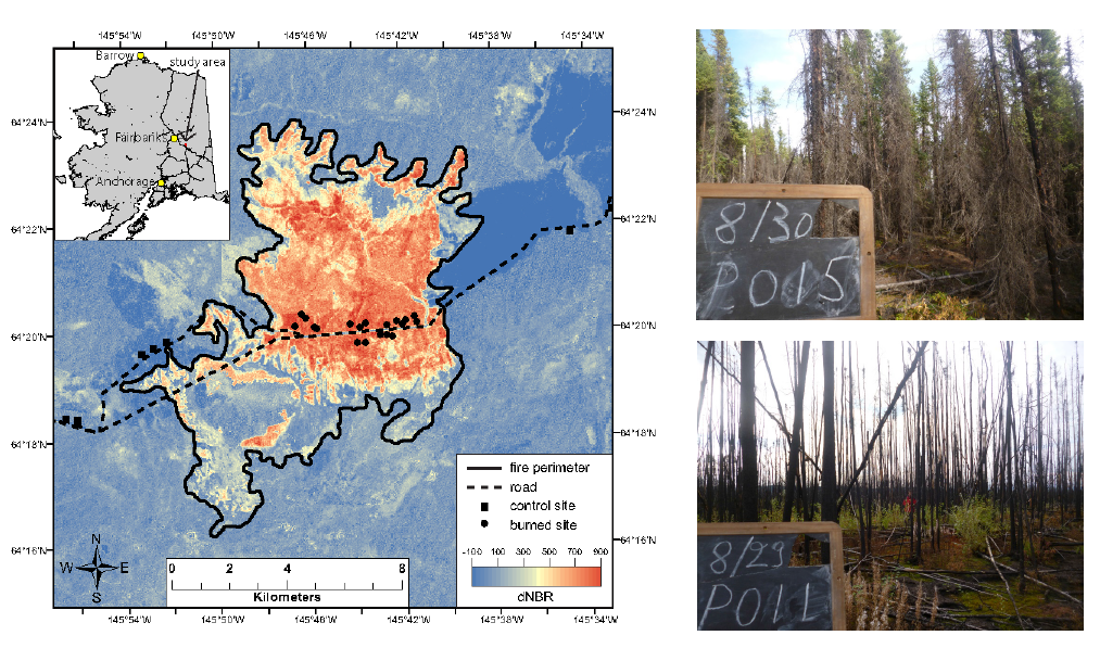 Fire severity varied across the Gilles Creek Fire in the interior of Alaska. Fire severity (“dNBR”) was estimated from Landsat data. The photos show two areas from the Gilles Fire: a high severity burn (P011, dNBR = 769) and a lower severity burn (P015, dNBR = 563). Image credit: Treseder et al.
