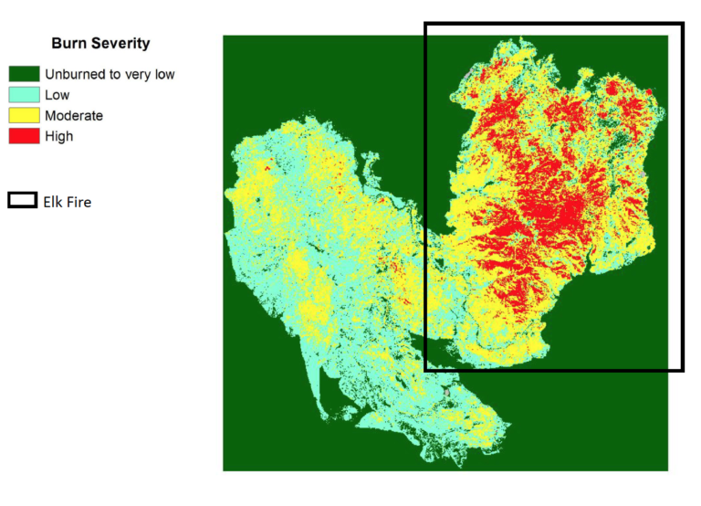 Lightning strikes started the August 2013 Elk Complex Fire in Idaho’s Boise National Forest. The fire burned 180,960 acres before it was contained. This is a Burned Area Reflectance Classification map of the fire. Image credit: USGS EROS/ U.S. Forest Service/ University of New Mexico