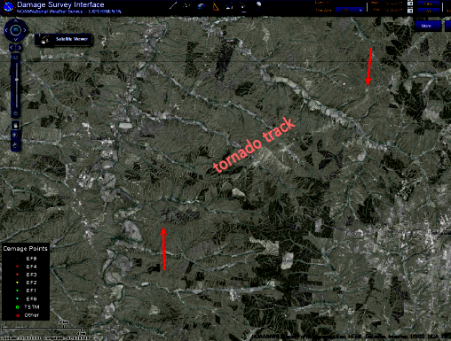*Since April 27, 2011, NASA’s Short-term Prediction Research and Transition, or SPoRT Center, has provided satellite imagery to the NWS to assist with their damage surveys. Starting 2012, SPoRT began incorporating imagery into the NWS’s Damage Assessment Toolkit, or DAT. The DAT is a smartphone, web browser, and tablet application that allows NWS meteorologists to go out in the field and perform a detailed storm damage survey. SPoRT incorporates various satellite imagery, including Landsat 7 and 8, into the DAT as an extra layer of information that NWS meteorologists can use to compare to their storm survey track. {details provided by NASA Research Meteorologist Andrew Molthan}