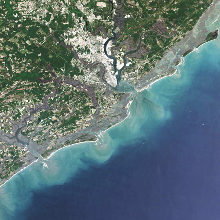 This Landsat image also shows that the bay is completely filled with salt marshes, making the area highly productive for seafood.