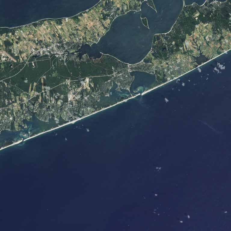 This Landsat image shows the fairly large coastal pond named Mecox Bay to the east with the eastern edge of Shinnecock Bay also displayed.