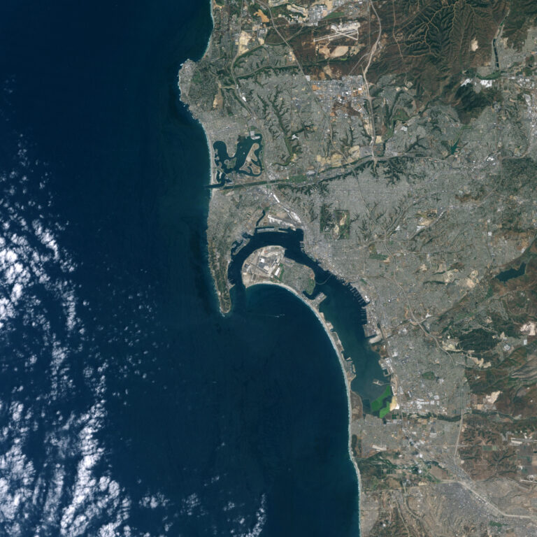The harbor serves as a major port for the Navy’s Pacific fleet, being the home port for several aircraft carriers. The docks and the crossing airplane runways for the Naval base are evident on this Landsat image.