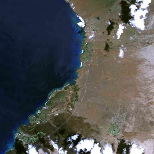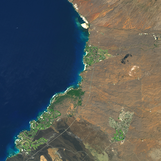 Hapuna and the other pocket beaches appear as an oasis in this otherwise fairly bleak landscape except for the areas irrigated as prominently shown on the Landsat imagery by the green vegetation.
