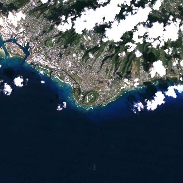 This large cone of an extinct volcano provides the iconic backdrop for photos of Waikiki Beach, one of the ten most famous beaches in the world—it is indicated on the Landsat image as a white sliver of coral sand along the shore.