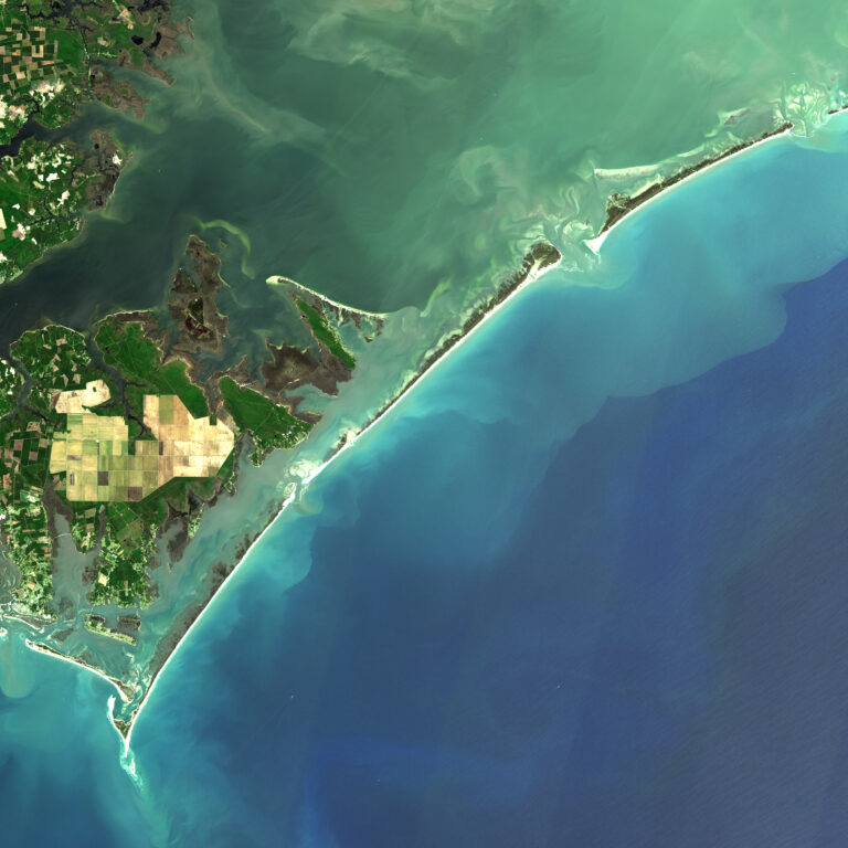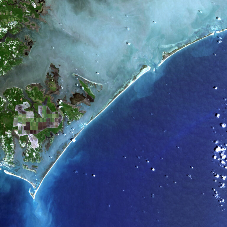 The Landsat image shows Ocracoke to the north as separated by an inlet from Portsmouth Island. The village of Ocracoke was built at the wide area of the island where it was protected from oceanic waves during coastal storms which include both winter nor’easters and hurricanes.