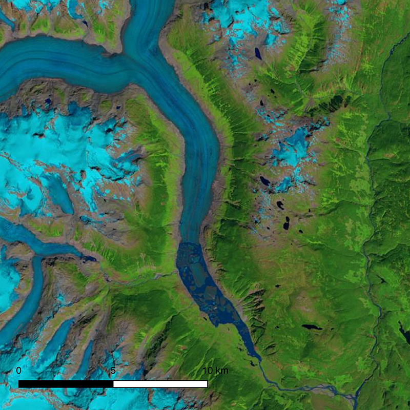 Landsat image showing snout of Klinaklini Glacier in late summer 2000. Image credit: UNBC