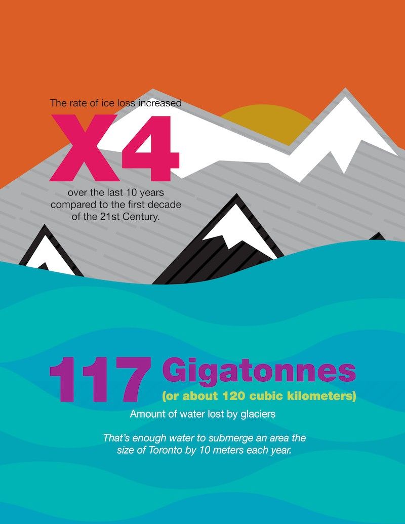 The research team used archives of high-resolution satellite imagery to create over 15,000 digital elevation models covering glaciers from California to the Yukon. These elevation models were then used to estimate total glacier mass change over the period of study. Over the period 2000 – 2018, glaciers in western North America lost 117 Gigatonnes of water or about 120 cubic kilometres – enough water to submerge an area the size of Toronto by 10 meters each year. Compared to the first decade of the 21st Century, the rate of ice loss increased fourfold over the last 10 years.