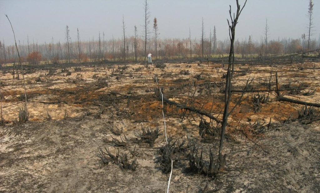 Remnants of a spruce forest complex following a severe wildfire in the Yukon Flats National Wildlife Refuge, Alaska. Wildfires are the dominant landscape-scale disturbance operating at annual time scales in Alaska, and fires play a major role in the rate and extent of vegetation growth and productivity of a site. Wildland fires typically result in the reduction of surface albedos shortly after occurrence and combustion of below and above-ground biomass results in the release of heat trapping gases to the atmosphere. Photo credit: Bruce Wylie, USGS.