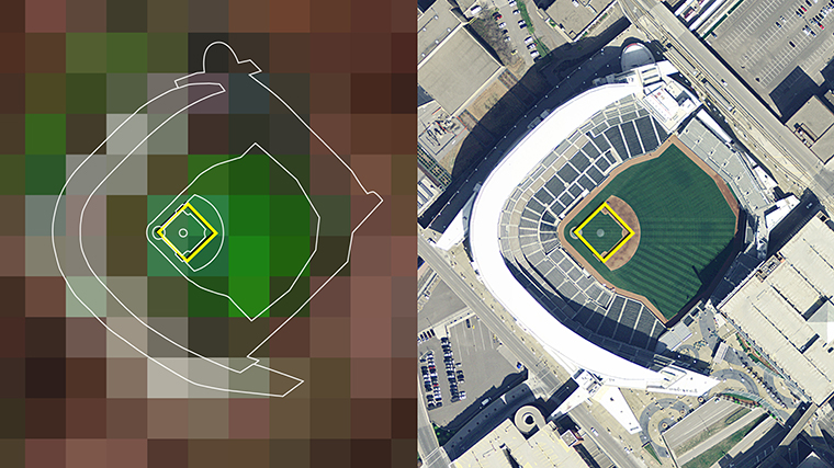 Target Field, Minneapolis, Minnesota, Home of 2014 MLB All-Star Game, Landsat image (left), aerial photograph (right). A single Landsat pixel is roughly the size of a baseball diamond.