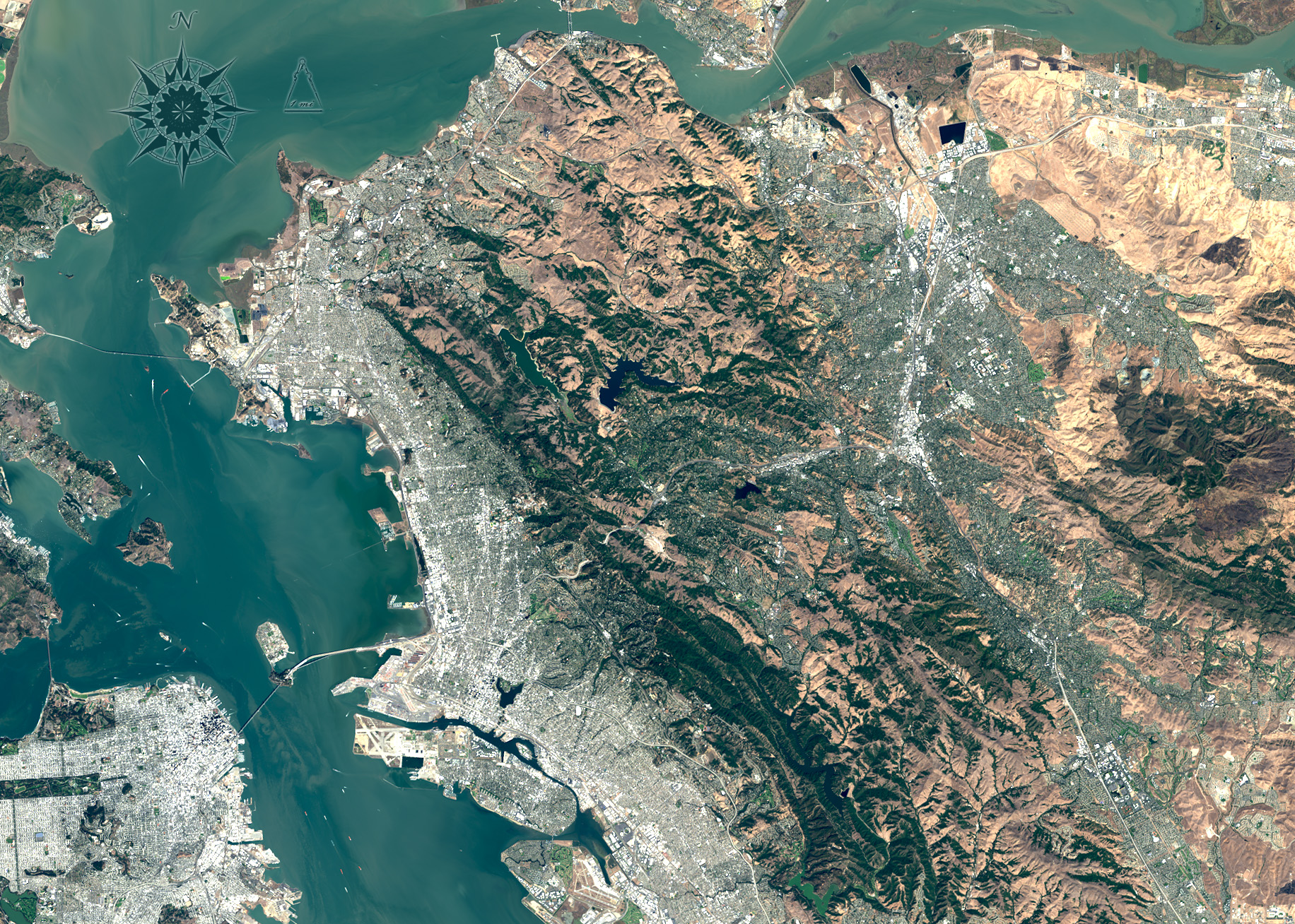 The Landsat image tells us more about the natural environment of Sicily. We can see the green vegetation that appears flanking Mt. Etna’s upper reaches and the volcano’s south-trailing emission plume as well as land use patterns (green forestlands, gold agricultural lands, and grey-white urban areas). Offshore, we can see sediment patterns in the coastal waters and some wave patterns. Were we to look at a series of these Landsat images over time we could map environmental changes.