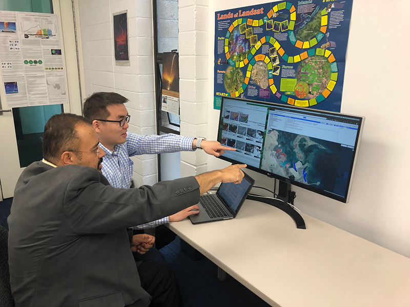 Lead author Wenzhao Li and his PhD advisor and team lead Hesham El-Askary, discussing their recent mangrove mapping work. Photo credit: Chapman University