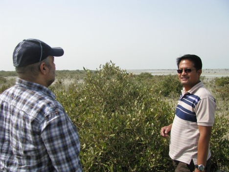 Co-author Mohammed Ali B. Qurban, the Director of the Center for Environment & Water at King Fahd University of Petroleum and Minerals, in the field next to a mangrove tree with Mangrove Scientist, Mr. Reynaldo Lindo. Photo credit: King Fahd University of Petroleum and Minerals