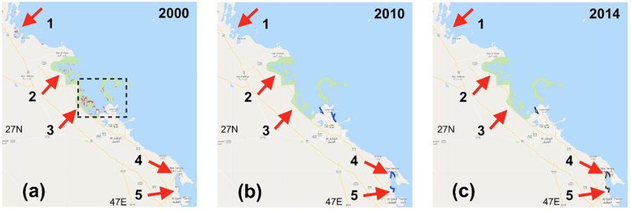 The team of researchers compared mangrove inventories of the Saudi Arabian coast from the years 2000, 2010, and 2014 and noticed that the 2000 inventory indicated a large mangrove habitat within the Jubail Conservation that was not there in the later studies. The 2000 inventory came from the Landsat-derived USGS Mangrove Forest Distribution inventory. This closely-validated dataset is often considered a baseline for mangrove mapping and monitoring.
