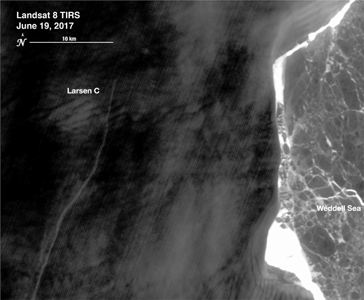 The two types of thermal imagery each have their advantages, spatial detail from TIRS and more than one observation per day for the lower resolution VIIRS. When they are combined, they allow a greater understanding of calving events that may occur in a polar winter’s total darkness.