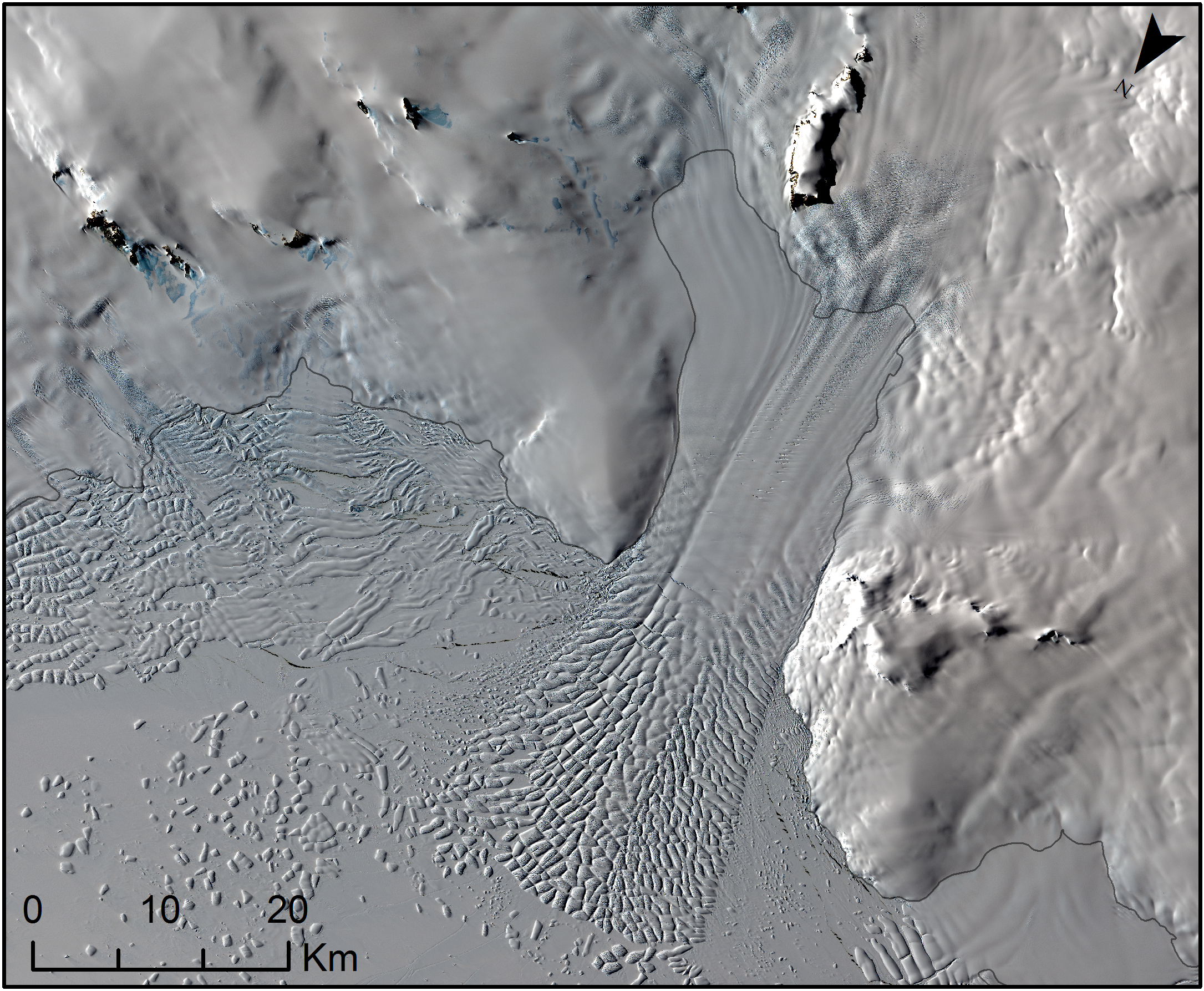 Pan-sharpened natural color composite of Land Glacier and its floating ice tongue, acquired on 8th February 2016 from Landsat 8’s Operational Land Imager. Gray line represents the 2015 grounding line position. Also visible are numerous blue ice exposures situated near nunataks in the Ickes Mountain Range. Image credit: Christie et al.