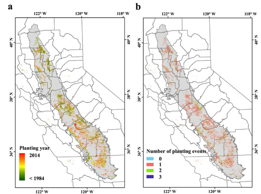 Statewide mapping of (a) planting years, and (b) number of crop conversions for all nut and fruit trees in California’s Central Valley. Image credit: Chen et al., 2018