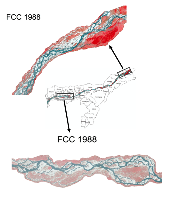 Stable river islands locally known as ‘chars’ are increasing in the Brahmaputra river. These chars are mainly eroded from the upper catchment of the river and deposited in lower Assam. The overall extent of the Brahmaputra river is also increasing at the cost of erosion of land surface along the river banks. The rate of char formation is greater than the rate at which the Brahmaputra river extent is increasing. These chars occupied approximately 33% of the overall area of the river for the 2017-2018 post monsoon season in Assam. These results are river boundary dependent.
