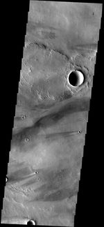 Note: this THEMIS visual image has not been radiometrically nor geometrically calibrated for this preliminary release. An empirical correction has been performed to remove instrumental effects. A linear shift has been applied in the cross-track and down-track direction to approximate spacecraft and planetary motion. Fully calibrated and geometrically projected images will be released through the Planetary Data System in accordance with Project policies at a later time.