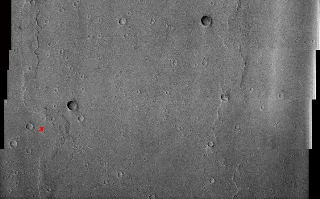 Viking 1 landed on a relatively smooth plain in Chryse Planitia (Plains of Gold), which is a low region of the northern hemisphere of Mars. The reported landing site is 22.48° N, 49.97° W. The landing site is marked with an X in the images. This region of Mars is dominated by plains, wrinkle ridges, and impact craters.