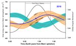 The horizontal scale is time of year on Mars, starting at left with the planet's farthest distance from the sun in each orbit. This point in the Mars year, called "Mars aphelion," corresponds to late autumn in the southern hemisphere. Numeric values on the horizontal axis are in Earth years; each Mars year lasts for about 1.9 Earth years.