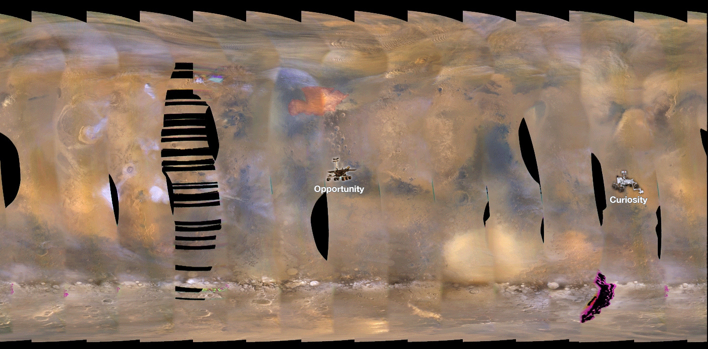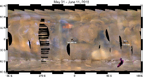 This set of images from NASA's Mars Reconnaissance Orbiter (MRO) shows a fierce, giant dust storm is kicking up on Mars, with rovers on the surface indicated as icons. The spread of the storm can be seen in the salmon-colored overlay. These images from MRO's Mars Color Imager start from May 31, when the dust event was first detected, and go through June 11, 2018.