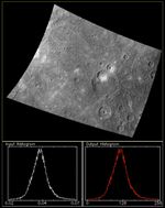 Today's feature is the 748-nm filter image from from the October 21, 2013 color presentation. The graphs underneath the image illustrate a basic principle of image processing: the contrast stretch. A computer is typically capable of displaying a black and white ("greyscale") image as a series of pixels with 256 levels of brightness, between 0 (black) and 255 (white). Therefore, in order to be displayed, the numerical values of the image must be "stretched" to cover the range 0 to 255. In the case of a calibrated MDIS image, the image values are in physical units of reflectance -- that is, the percentage of incident light that the surface reflects. The graphs underneath the image are histograms. The x-axis is the range of pixel values that occur in the image, and the y-axis is the frequency of the values. The histogram on the lower left shows that the range of reflectance values in the image is from about 0.02 to 0.07 (or about 2% to 7% reflectance). The plot peaks at about 0.04, indicating that the most frequent pixel value is about 0.04. The plot on the lower right shows how the input pixel values have been scaled from 0 to 255 to produce the image above. Note that to display a color image (i.e., in red-green-blue), each of the three input color planes is stretched separately.