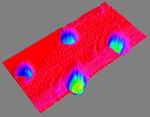 The image shows four round pits, only 5 microns in depth, that were micromachined into the silicon substrate, which is the background plane shown in red. This image has been processed to reflect the levelness of the substrate.