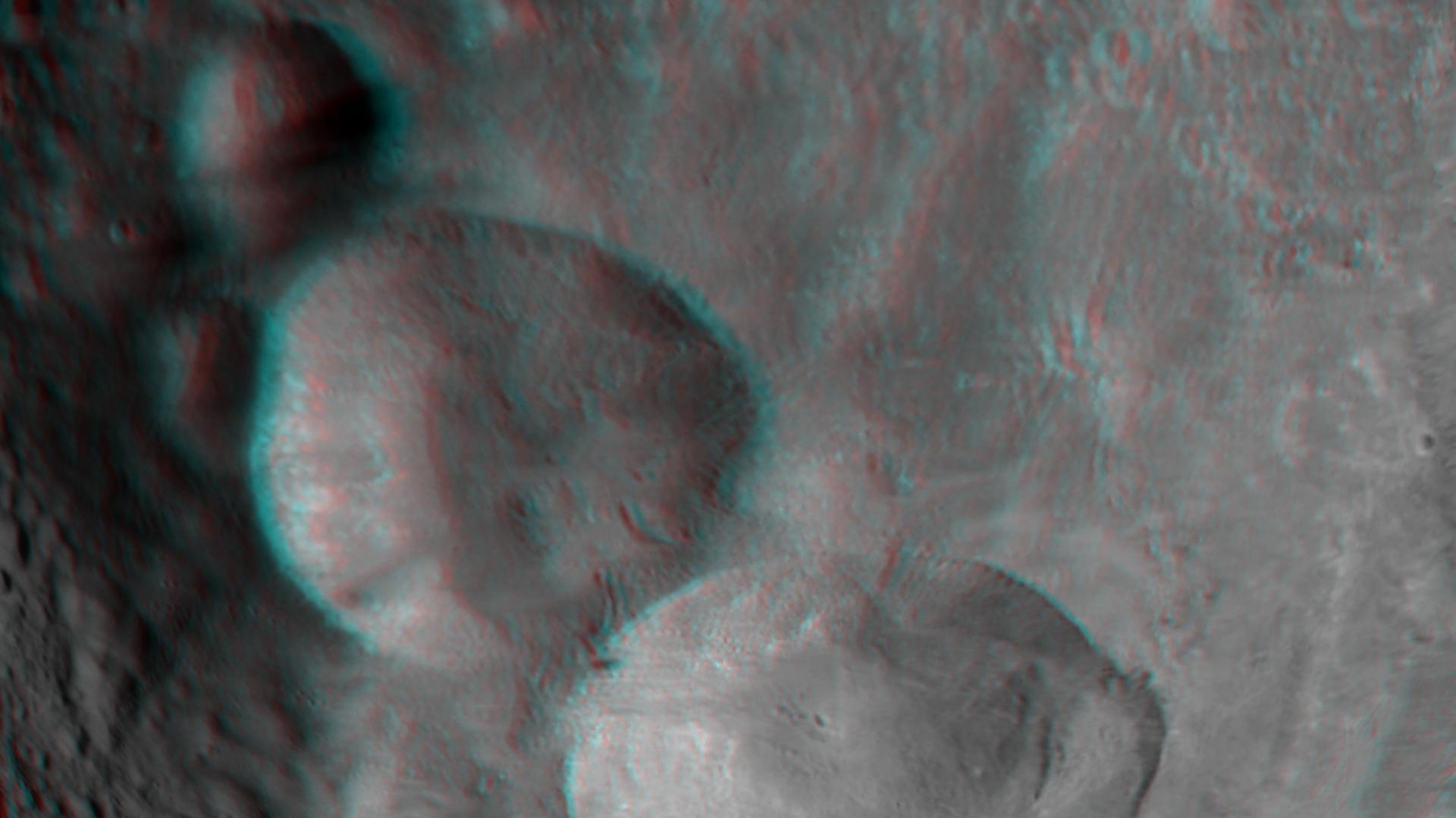 This 3-D image, called an anaglyph, shows the topography of Vesta's "Snowman" craters. To create this anaglyph two differently colored images are superimposed with an offset to create depth. When viewed through red-blue glasses, this anaglyph shows a 3-D view of Vesta's surface. The images used to generate the two differently colored images that make up this anaglyph were obtained during Dawn's mission in August 2011. At the time the distance from Dawn to Vesta was about 2,700 kilometers (1,700 miles), which results in an image resolution of about 250 meters (820 feet) per pixel. The depth effect or topography differences in this anaglyph were calculated from the shape model of Vesta. North points to the left in this anaglyph. The three "snowman" craters dominate this image: the bottom crater, which is about 63 kilometers (40 miles) in diameter on average, has been named Marcia; the middle crater, which is about 53 kilometers (33 miles) in diameter on average, has been named Calpurnia and the top crater, which is about 24 kilometers (15 miles) in diameter on average, has been named Minucia. It is likely that Marcia and Calpurnia formed from the impact of a binary asteroid and that Minucia formed in a later impact. The region surrounding the three craters is relatively smooth because this is the ejecta blanket of the craters. A number of slumping features are clearly seen in both Marcia and Calpurnia.