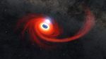 A disk of hot gas swirls around a black hole in this illustration. Some of the gas came from a star that was pulled apart by the black hole, forming the long stream of hot gas on the right, feeding into the disk. These events are formally known as tidal disruption events, or TDEs. It can take just a matter or weeks or months from the destruction of the star to the formation of the disk. The gas gets hotter the closer it gets to the black hole, but the hottest material can be found above the black hole. This hottest material is cloud of plasma (gas atoms with their electrons stripped away) known as a corona.