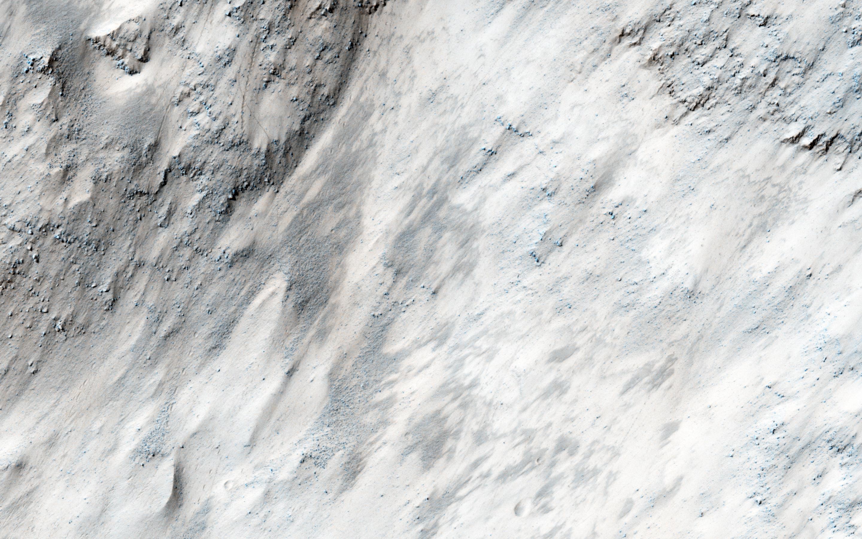 In Masursky Crater we see huge numbers of boulder trails. These appear as dashed lines produced by boulders tumbling down steep slopes, periodically gouging troughs in the ground. Why are there so many boulder trails here? Possibly the ejecta from Mojave Crater disturbed the surface and sent the boulders tumbling downhill.