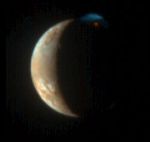 As in the LORRI picture, this processed image shows the nighttime glow of the Tvashtar volcano and its plume rising 330 kilometers (200 miles) into sunlight above Io's north pole. However, the MVIC picture reveals the intense red of the glowing lava at the plume source and the contrasting blue of the fine dust particles in the plume (similar to the bluish color of smoke), as well as more subtle colors on Io's sunlit crescent. The lower parts of the plume in Io's shadow, lit only by the much fainter light from Jupiter, are almost invisible in this rendition. Contrast has been reduced to show the large range of brightness between the plume and Io's disk.