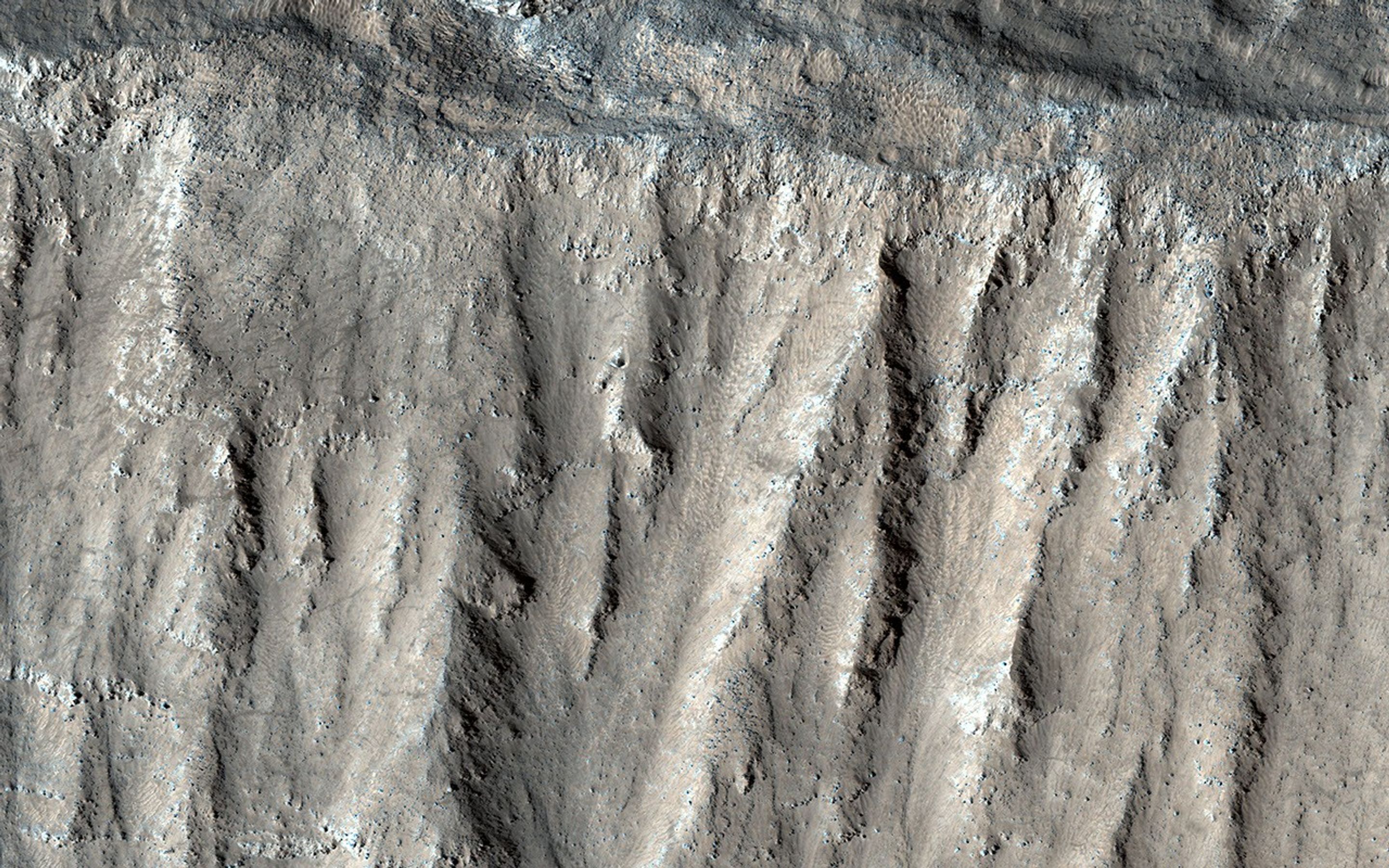 We can see chutes carved into the soft dust that has built up on the slope, with some similarities to gully landforms elsewhere on the planet.