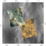 These two Compact Reconnaissance Imaging Spectrometer for Mars (CRISM) images were acquired over the northern plains of Mars near one of the possible landing sites for NASA's Phoenix mission, set to launch in August 2007. The lower right image was acquired first, on Nov. 29, 2006, at 0720 UTC (2:20 a.m. EST), while the upper left image was acquired about one month later on Dec. 26, 2006, at 0030 UTC (or Dec. 25, 2006, at 7:30 p.m. EST). The CRISM data were taken in 544 colors covering the wavelength range from 0.36-3.92 micrometers, and show features as small as about 20 meters (66 feet) across. The images shown above are red-green-blue color composites using wavelengths 0.71, 0.6, and 0.53 micrometers, respectively (or infrared, red, and green light), and are overlain on a mosaic of Mars Odyssey Thermal Emission Imaging System (THEMIS) visible data. Each image covers a region about 11 kilometers (6.6 miles) wide at its narrowest, and they overlap near 71.0 degrees north latitude, 252.8 degrees east longitude
